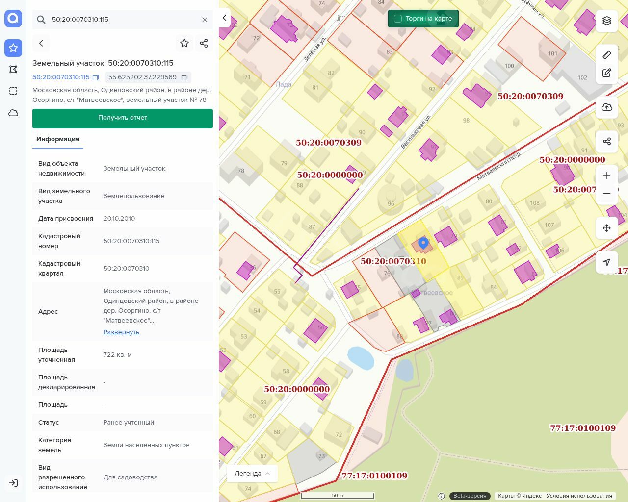 Земельный участок, площадь: 722 кв.м., кадастровый номер: 50:20:0070310:115. Категория земель: земли населенных пунктов, вид разрешенного использования: для садоводства